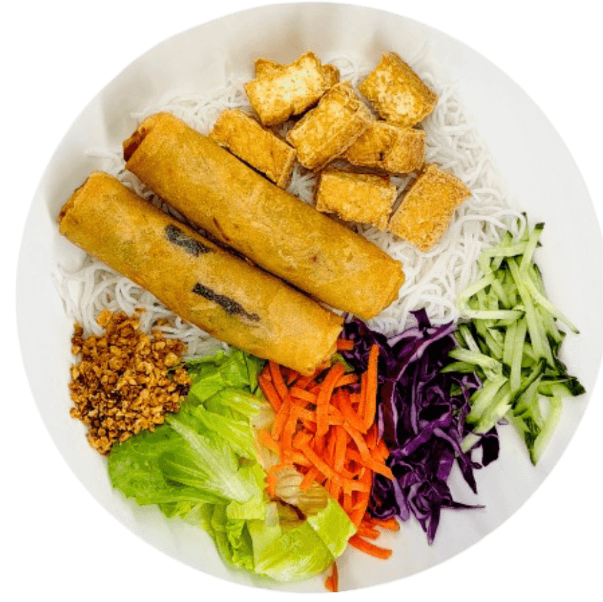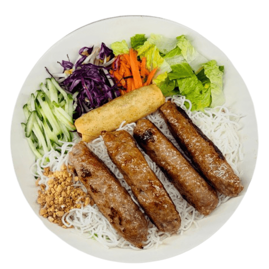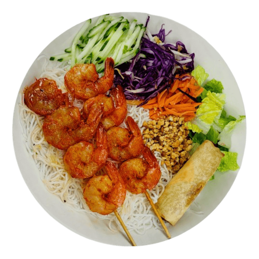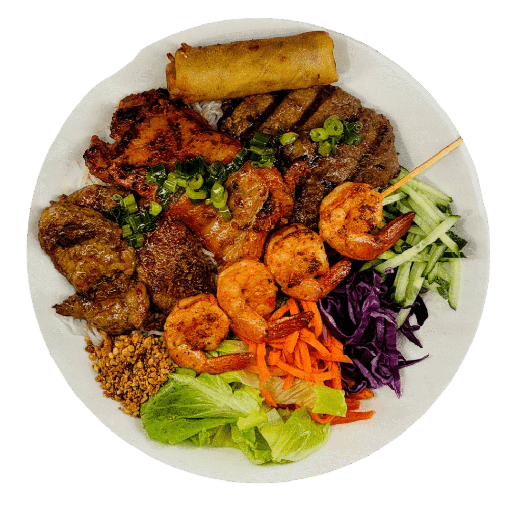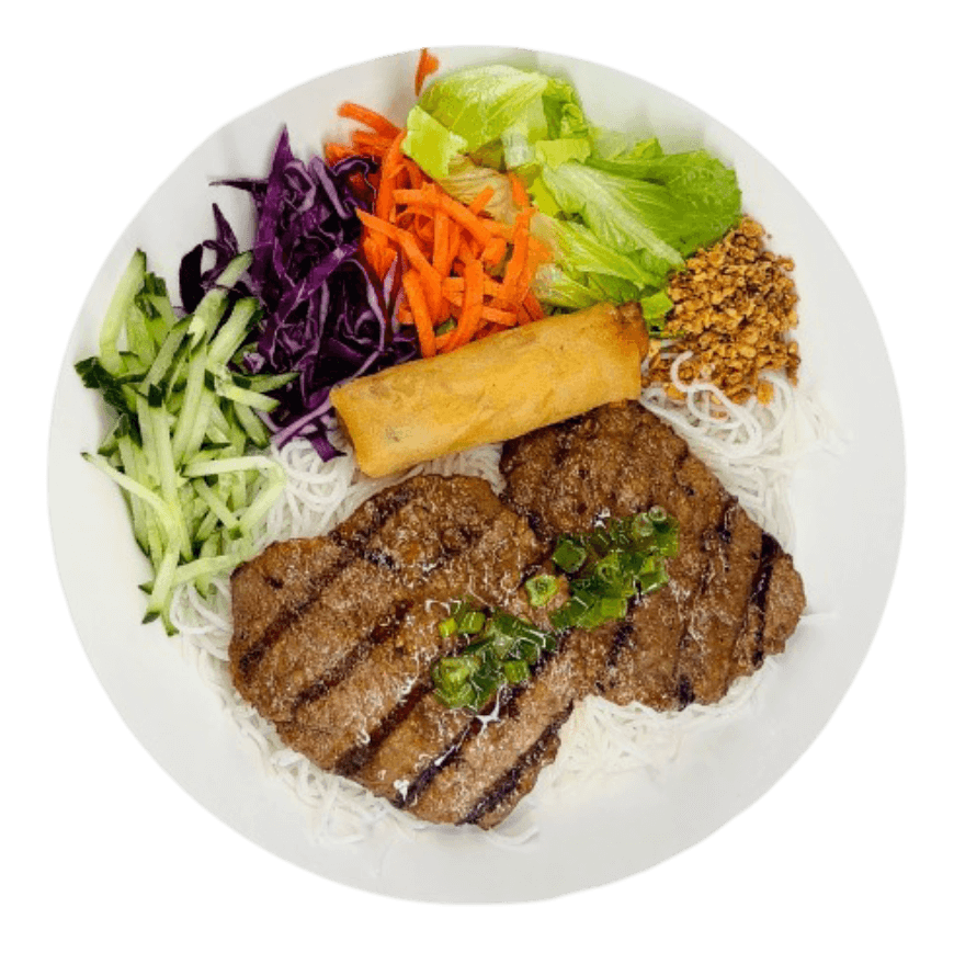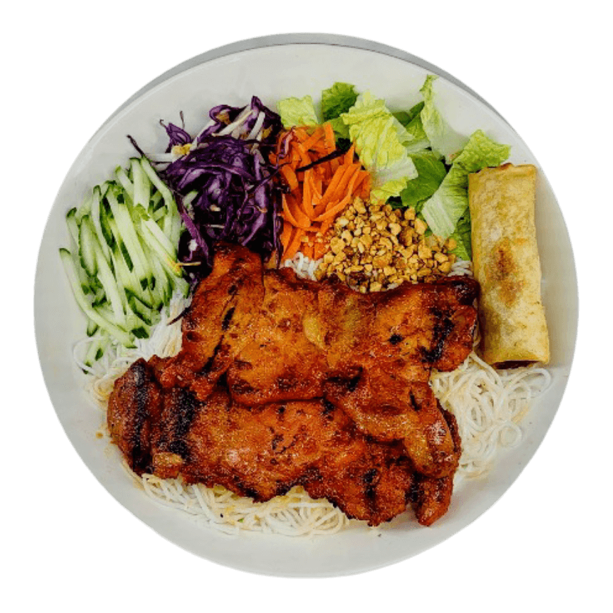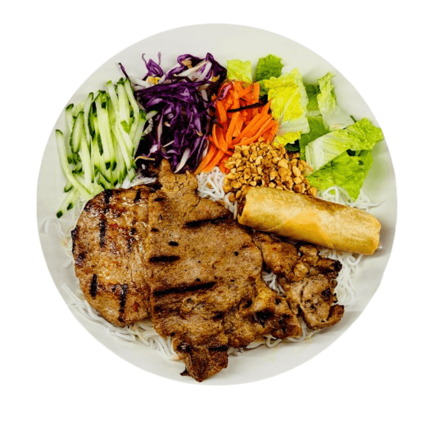 Grilled meat with colorful salad, served with your choice of rice or vermicelli and fish sauce on the side