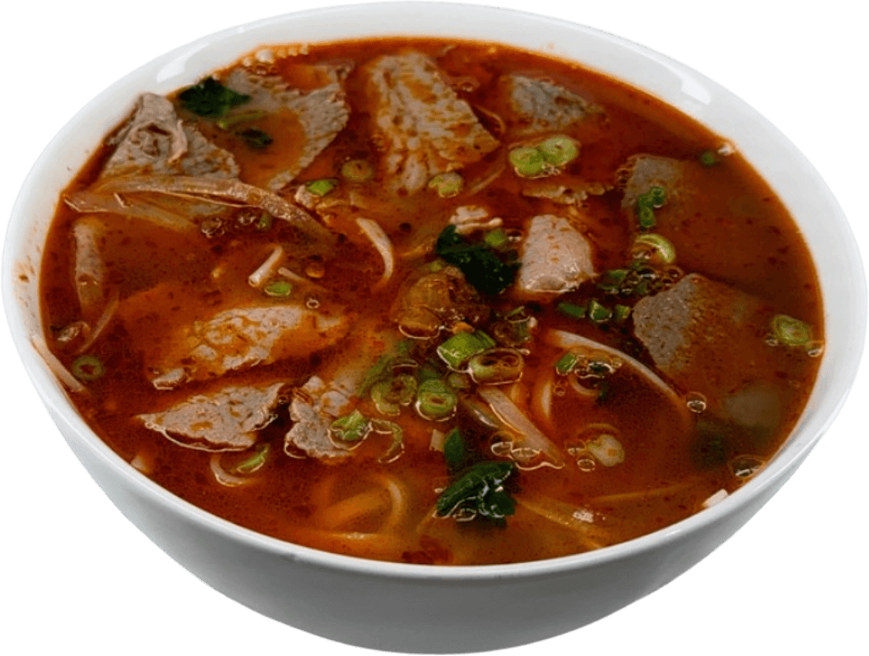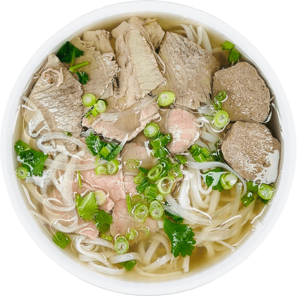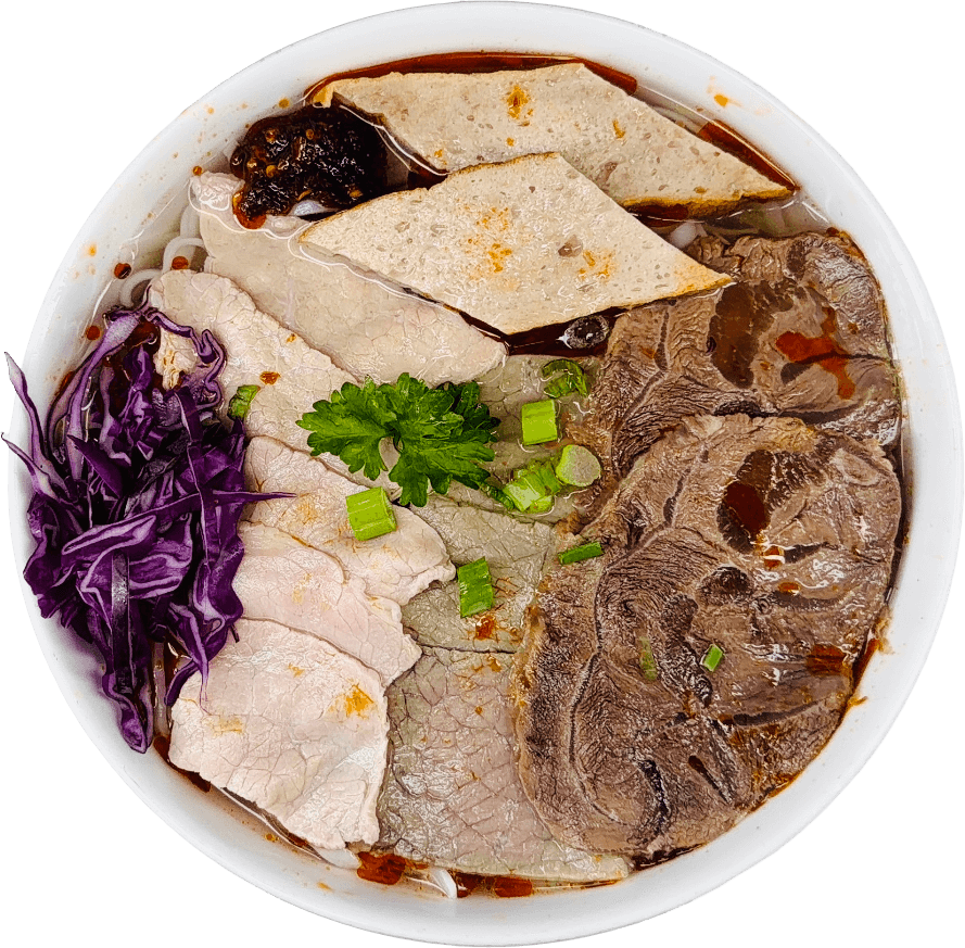 Bold and aromatic Vietnamese beef soup with lemongrass, chili, beef shank, and pork sausage, served with thick rice noodles.