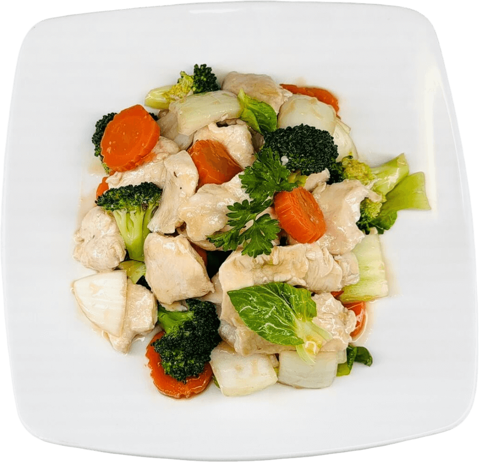 Filled with crunchy broccoli, carrot, onion, mushroom, bok choy and celery stir fried with signature Cantonese sauce