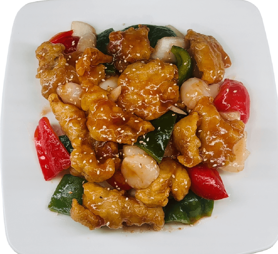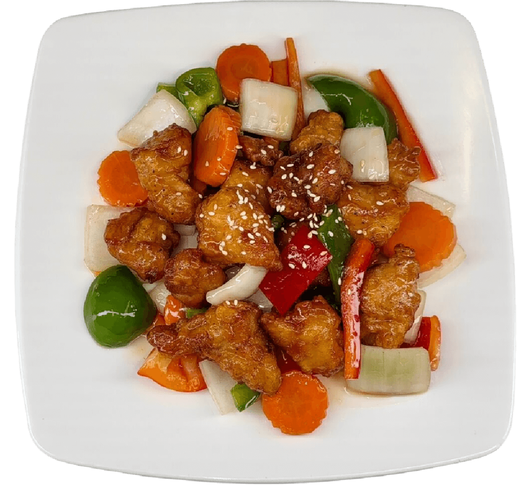 Tender chicken or ribs fried crisp, then stir- fried in a classic sweet and sour sauce with pineapple, bell pepper, onion, and lychee